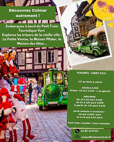 Départ du Petit Train Touristique de Colmar - Sarl TRAIN'S : 3 rue Kléber F - 68000 COLMAR Bureau & secrétariat : Anne LUDMANN - Sarl TRAIN'S 1 rue Edighoffen F – 68000 COLMAR Tél : 03 89 24 19 82 E-mail : contact@colmarentrain.fr Site internet : www.colmarentrain.fr Horaires de bureau : du lundi au vendredi de 9h à 16h Horaires d'accueil : 7 jours sur 7, actuellement de 9h à 18h30 congés annuels du 1er décembre 2025 au 5 janvier 2026