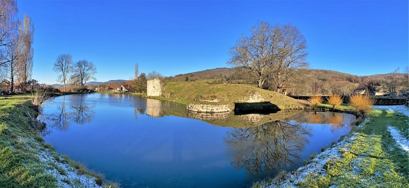 Contre la base de la tour d’Alone, tour carrée du XIIème siècle, s’appuient les bases des courtines reconstruites au XVIIIème siècle, flanquées de trois tours rondes. Une quatrième tour ronde reste à découvrir. La tour septentrionale offre une salle voûtée très bien conservée qui abrite une population de petites chauves-souris. Ces vestiges, partiellement entourés des douves, montrent l’emplacement du pont-levis des XVIème-XVIIème siècles.