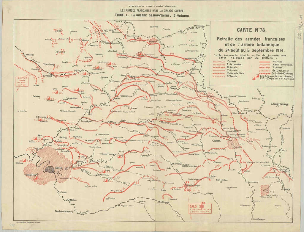 La carte ci-dessous indique les positions des armées françaises et britannique lors de la retraite effectuée du 24 août au 5 septembre 1914.