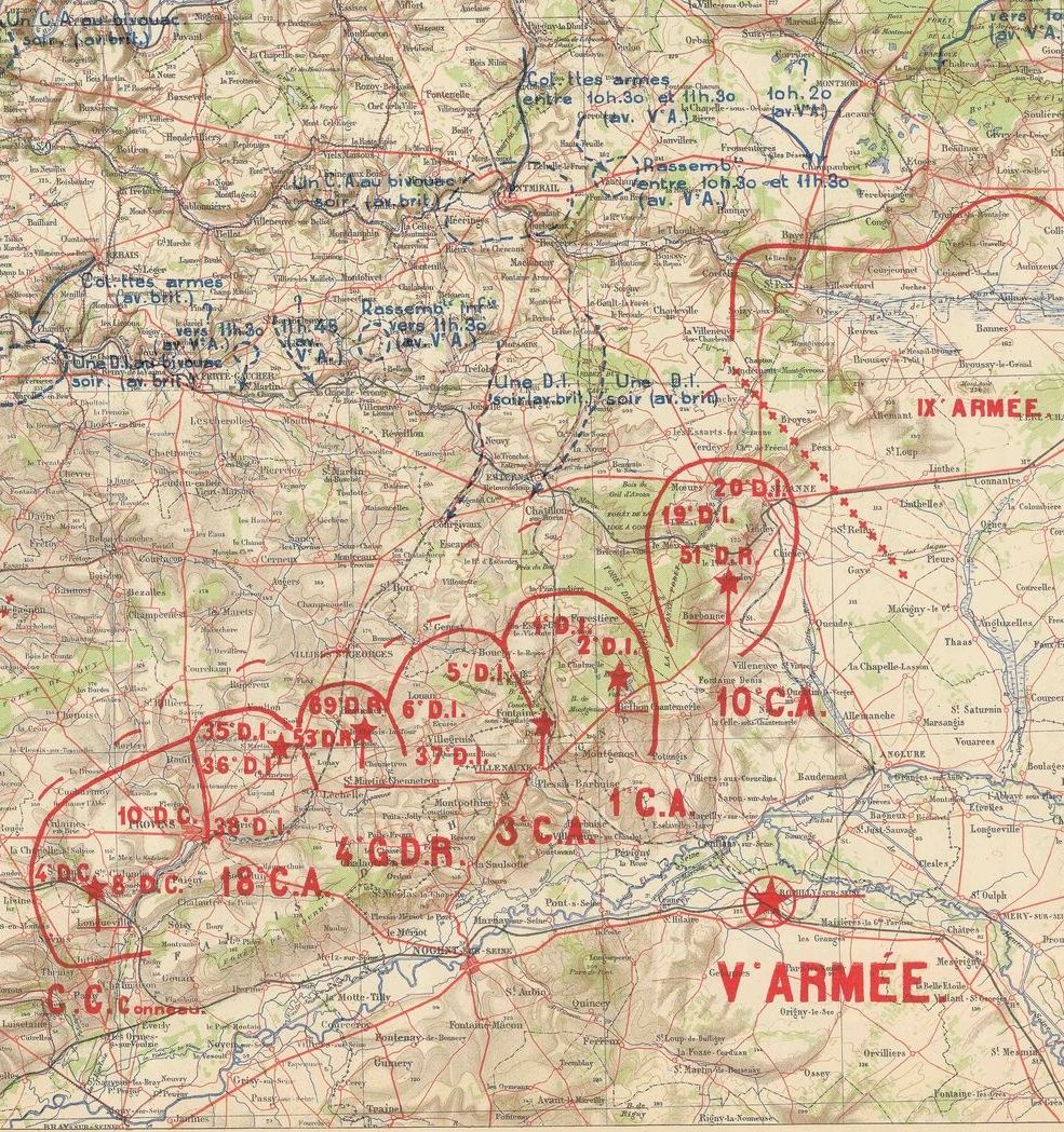 Il apprend, tout vibrant, que l’offensive est reprise le lendemain. Les hommes oublient leur fatigues, leurs misères des jours et des nuits précédents, écoutent et se pénètrent du fameux ordre du jour du Général Joffre qui leur est lu ce soir là par leur Commandant de Compagnie.