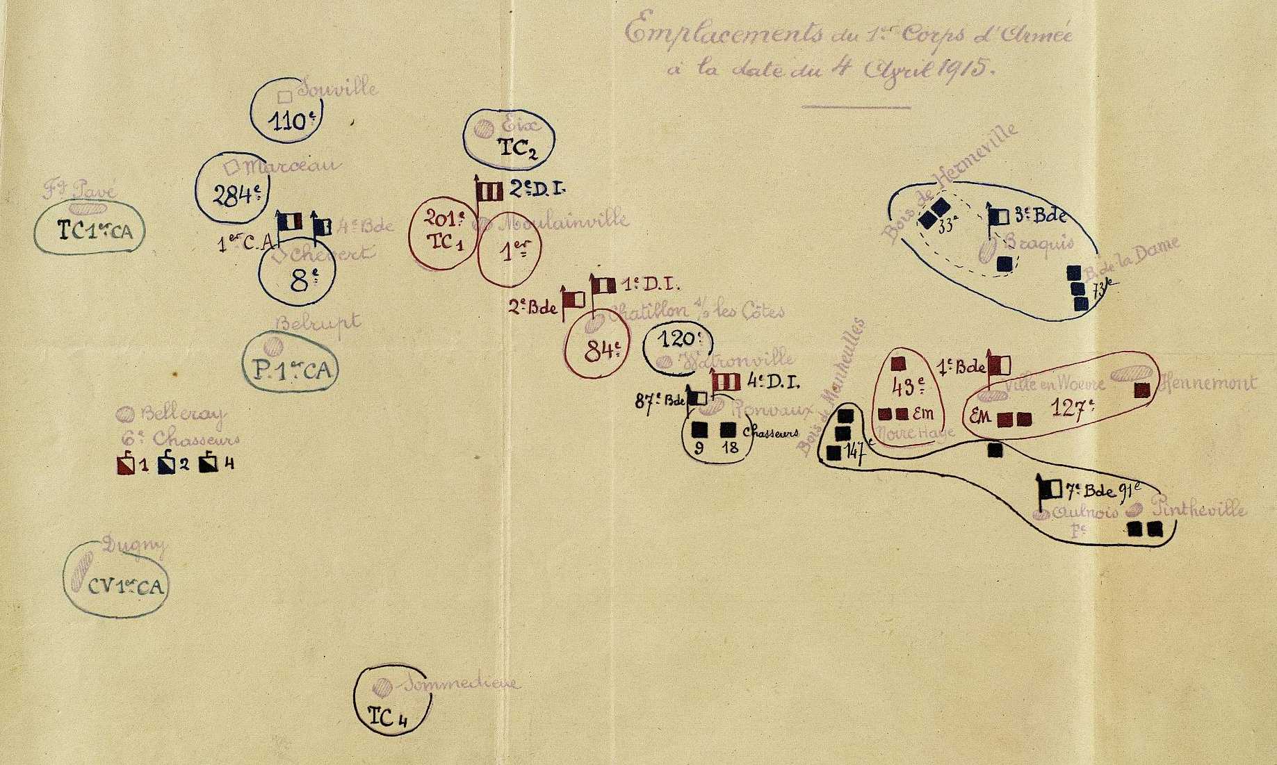 2 - La deuxième carte, dessinée le 12 avril, montre les objectifs assignés au 127ème RI, 7 jours plus tôt : le bois de Pareid, le bois de Parfondrupt et les côtes 217 et 226.Les objectifs, sur la droite de la carte, sont situés au sud du Rupt de Butel et à l'est des positions tenues par le 284 ème RI.