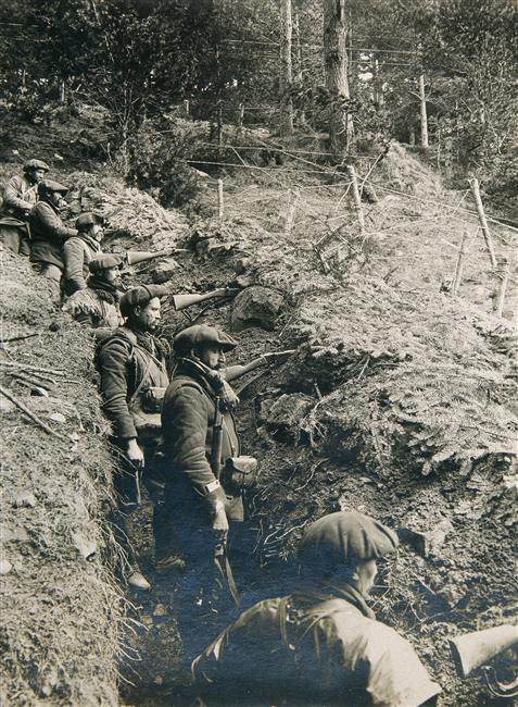Chasseurs-alpins dans une tranchée des Vosges, environs du col de la Schlucht Photo (C) Paris - Musée de l'Armée, Dist. RMN-Grand Palais Pascal Segrette.