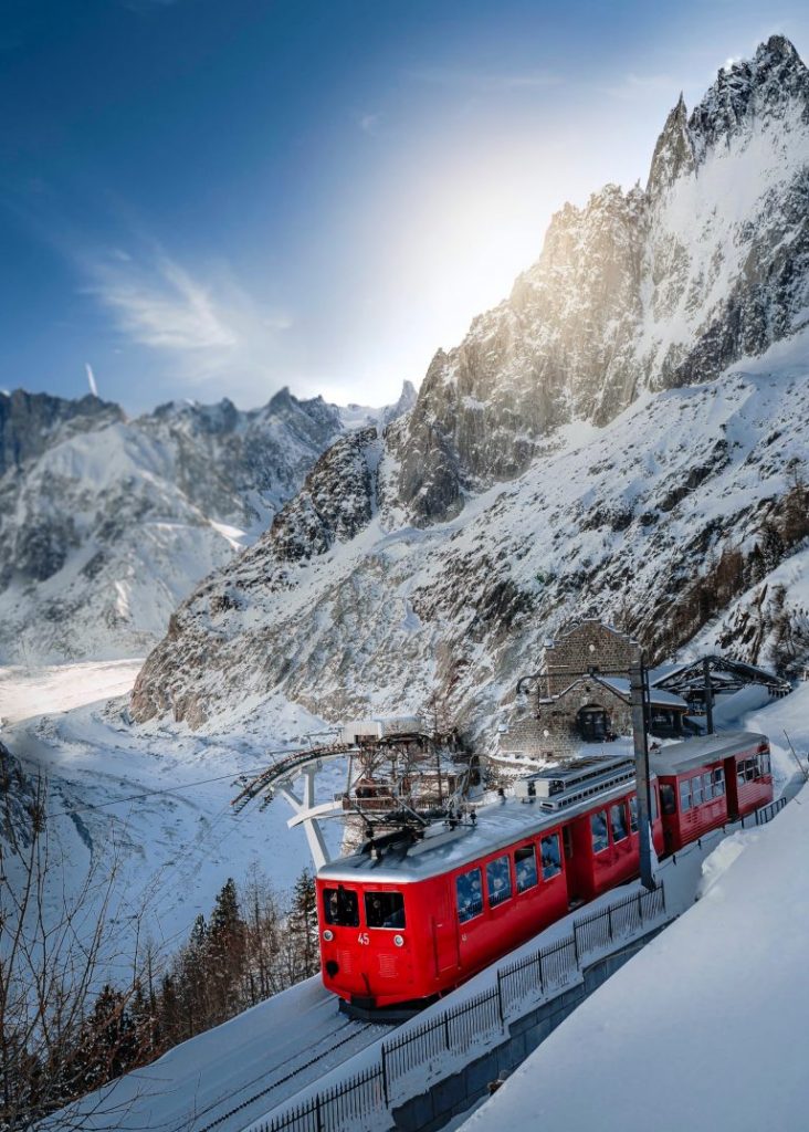 Approchez-vous du glacier de la Mer de Glace et de sa grotte, grâce au fameux train à crémaillère rouge ! Profitez d’un voyage de 20 minutes à observer les montagnes, avant d’arriver face au glacier. Si vous prenez le temps d’aller jusque là, prenez un moment de plus pour explorer l’impressionnante grotte. (Attention, il y a 500 marches pour y accéder!)